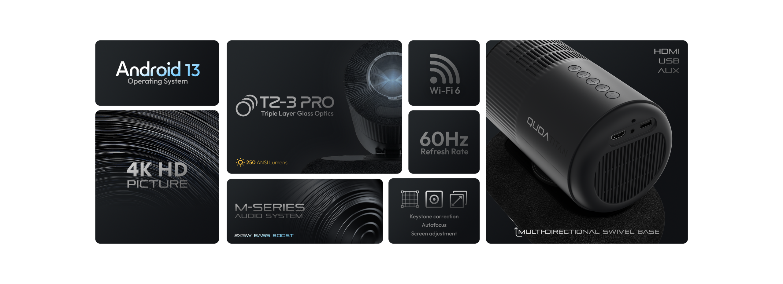Experience a new standard in home projection with the Quda Titan Pro. A refined balance of intelligent technology using Android 13 operating system, immersive sound with dual 4Ω 2 x 5W speakers with an advanced MV silicone chipset, for effortless performance. Enjoy remarkable clarity with 4k video playback support with TZ-3 Pro Triple Layer glass lens, bringing films, series and live events to life. Designed for simplicity, the Quda Titan Pro features intelligent Auto Focus Technology that automatically adjusts for a sharp image within seconds. The Quda Titan Pro also includes WiFi & Bluetooth 5.4 wireless connectivity and HDMI for effortless connection between your devices. Mirror content, stream wirelessly or pair external speakers to tailor your setup.